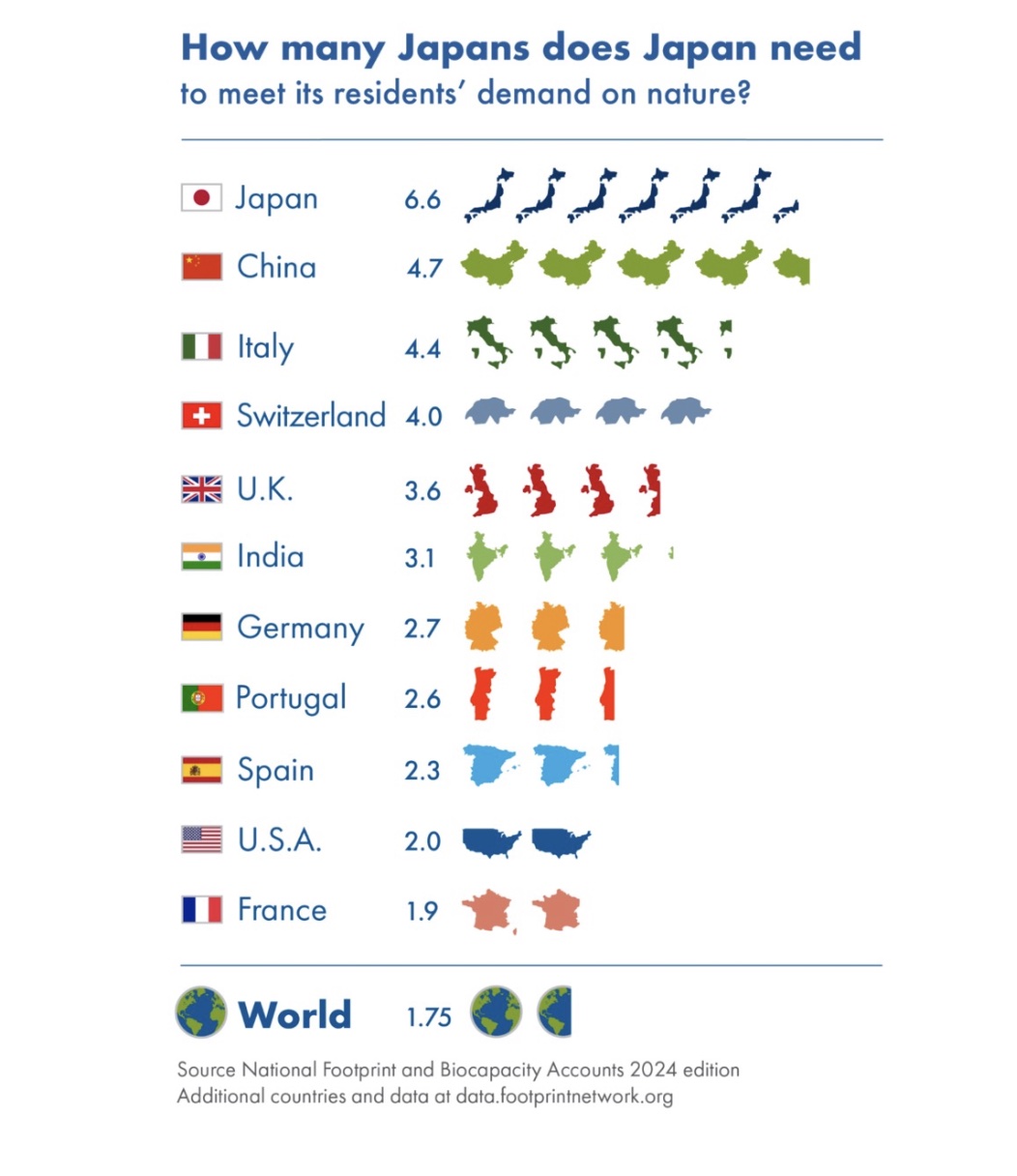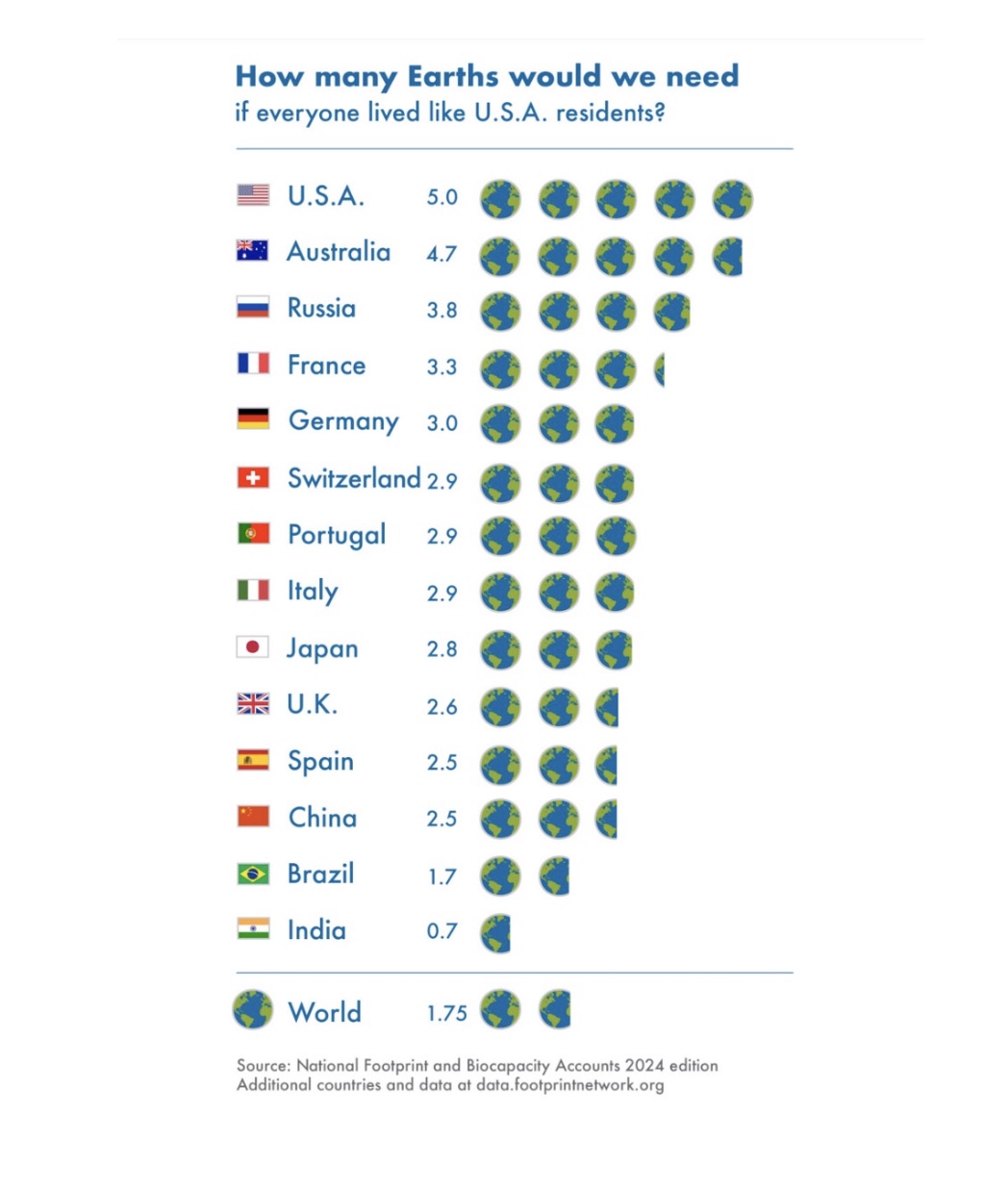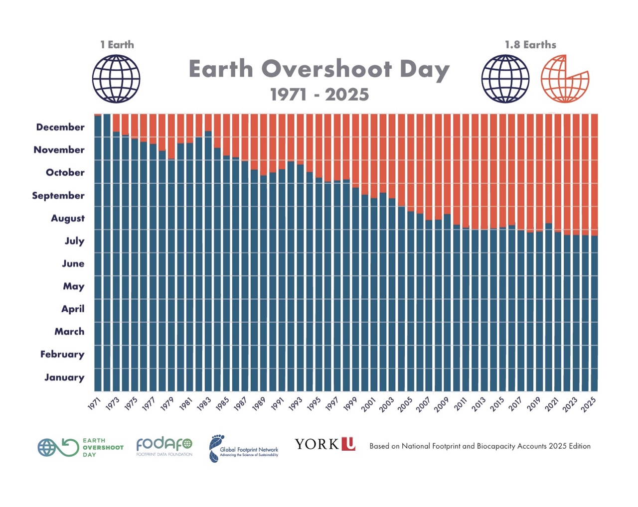 2025 ist der Overshoot Day sogar acht Tage früher als noch vor einem Jahr – denn die zugrundeliegenden Daten ändern sich: So hat die Kohlenstoffbindungskapazität der Ozeane abgenommen, der ökologische Fußabdruck pro Kopf stieg, die Pro-Kopf-Biokapazität, also die jeweils verfügbare Fläche zur Ressourcenbereitstellung, sank dagegen.