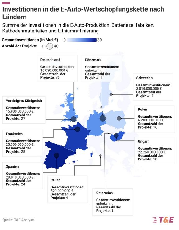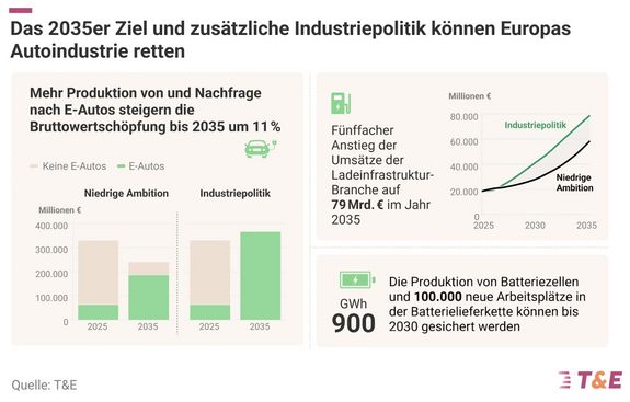 "Im Vergleich zu heute könnte es zu einem Verlust von bis zu eine Million Arbeitsplätzen kommen", so die Studie. Bis zu zwei Drittel der geplanten Batterieinvestitionen in der EU könnten ebenfalls verloren gehen, während der Ladeinfrastrukturbranche in den nächsten zehn Jahren potenzielle Einnahmen in Höhe von 120 Milliarden Euro entgingen.