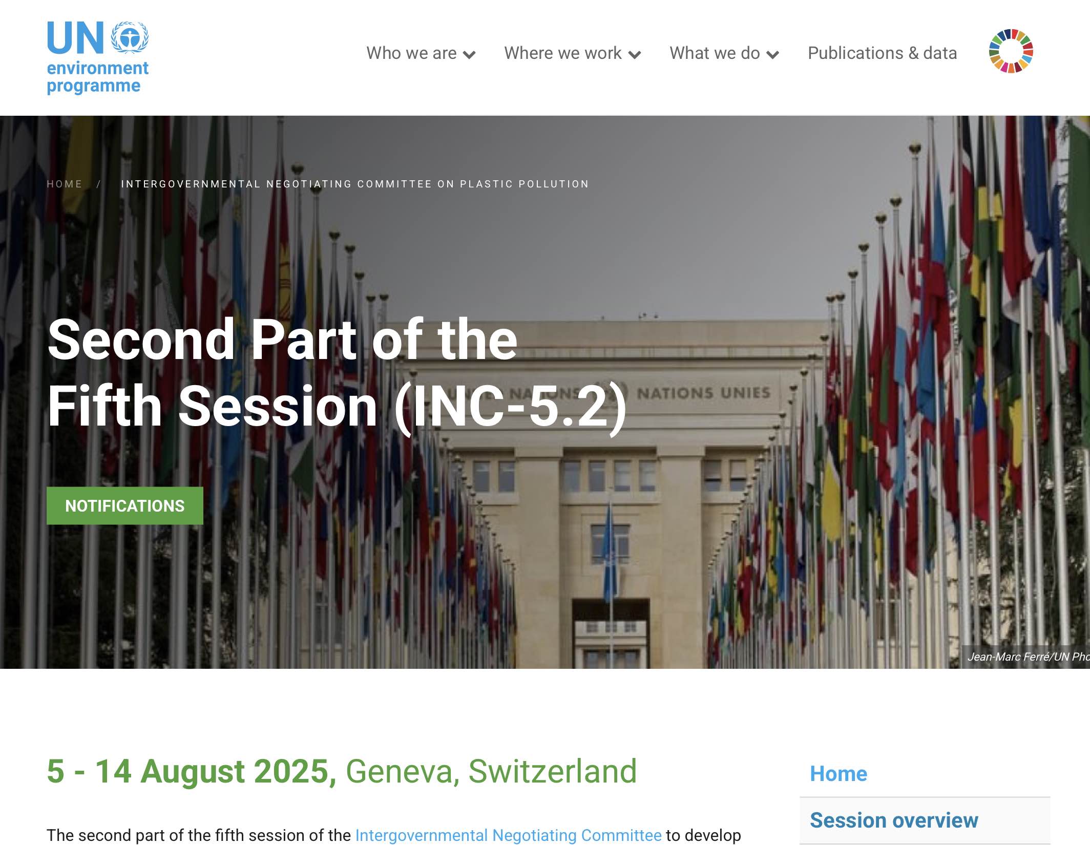 Der zweite Teil der fünften Sitzung des zwischenstaatlichen Verhandlungsausschusses zur Ausarbeitung eines internationalen rechtsverbindlichen Instruments zur Bekämpfung der Plastikverschmutzung, auch in der Meeresumwelt (INC-5.2), findet vom 5. bis 14. August 2025 im Palais des Nations in Genf in der Schweiz statt.